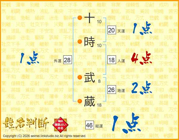 生活面を象徴する運勢です。外部から受ける影響力を表し、結婚運、家庭運や職場、環境への順応性を表します。総運から人運を引いた画数。姓や名が1文字の場合を除く。