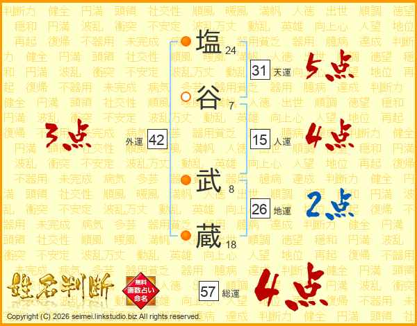 塩谷武蔵さんの総運は57画の4点!