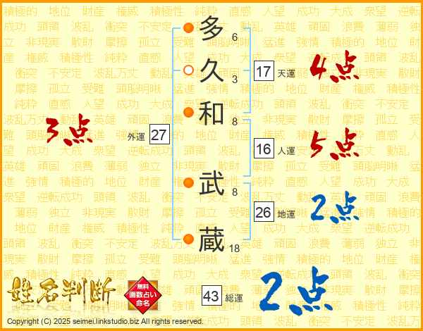 多(6画)久(3画)和(8画) 武(8画)蔵(18画)