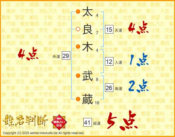 太(4画)良(7画)木(4画) 武(8画)蔵(18画)