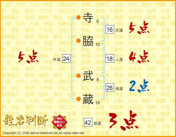 寺(6画)脇(10画) 武(8画)蔵(18画)