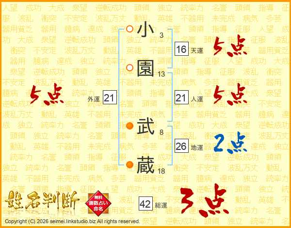 生活面を象徴する運勢です。外部から受ける影響力を表し、結婚運、家庭運や職場、環境への順応性を表します。総運から人運を引いた画数。姓や名が1文字の場合を除く。