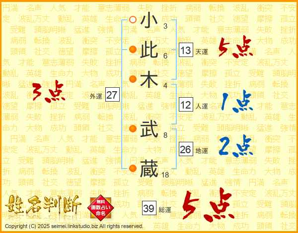 小(3画)此(6画)木(4画) 武(8画)蔵(18画)
