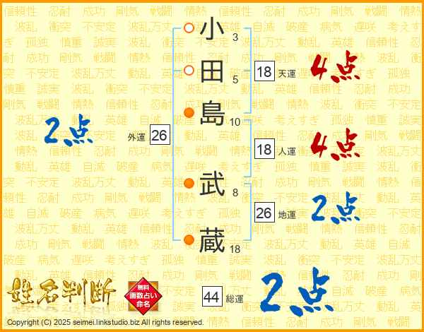 小(3画)田(5画)島(10画) 武(8画)蔵(18画)