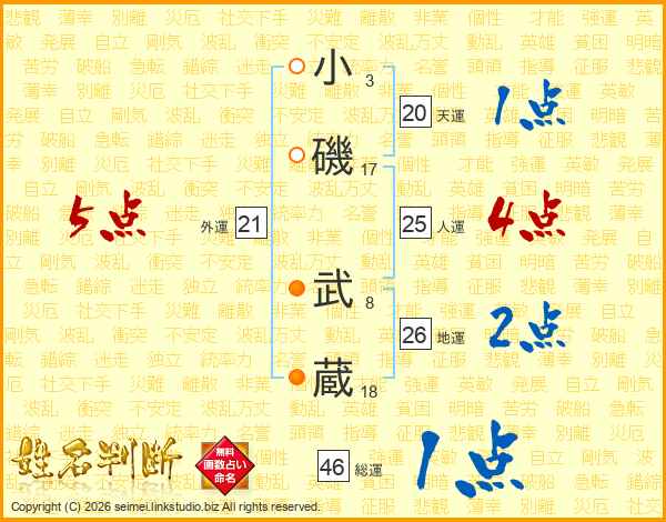 小(3画)磯(17画) 武(8画)蔵(18画)