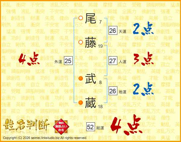 尾(7画)藤(19画) 武(8画)蔵(18画)