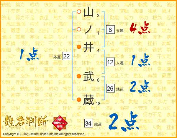 山(3画)ノ(1画)井(4画) 武(8画)蔵(18画)