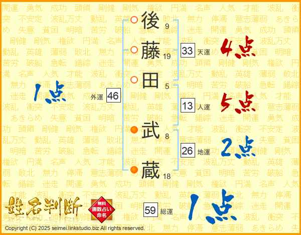 後(9画)藤(19画)田(5画) 武(8画)蔵(18画)
