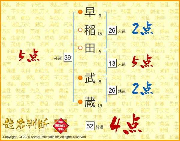 早(6画)稲(15画)田(5画) 武(8画)蔵(18画)
