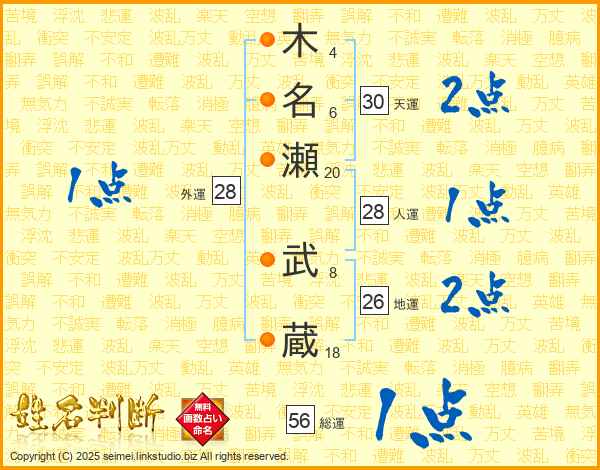 木(4画)名(6画)瀬(20画) 武(8画)蔵(18画)