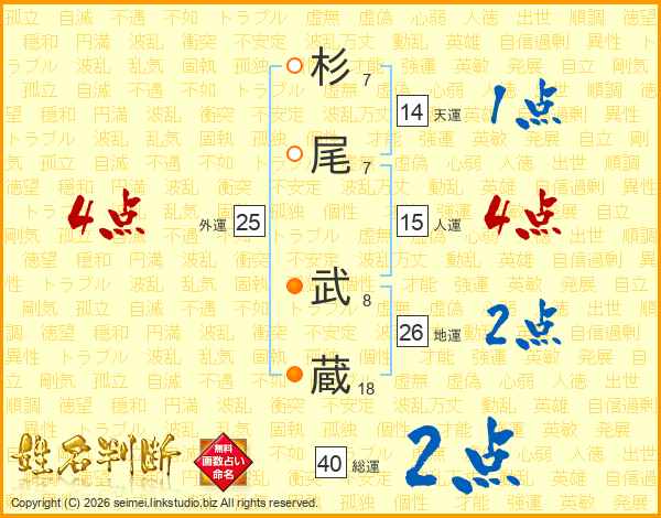 杉(7画)尾(7画) 武(8画)蔵(18画)