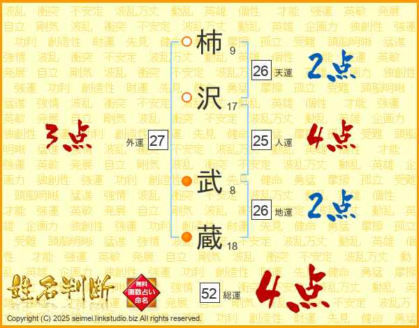 柿沢武蔵さんの総運は52画の4点!