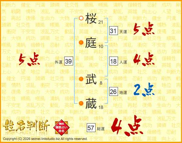 桜庭武蔵さんの総運は57画の4点!