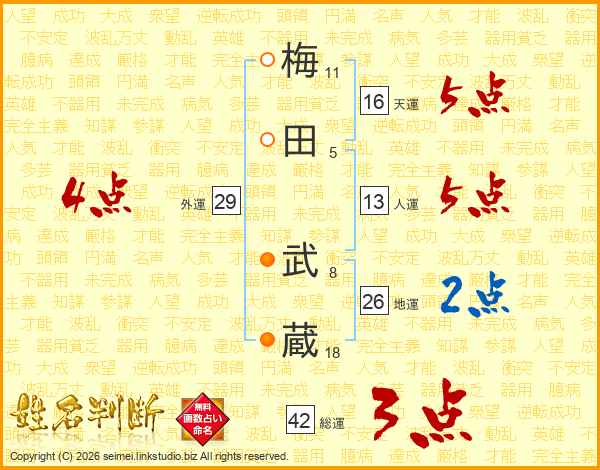 梅田武蔵さんの総運は42画の3点!