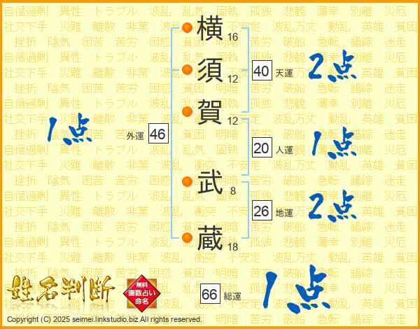 横(16画)須(12画)賀(12画) 武(8画)蔵(18画)