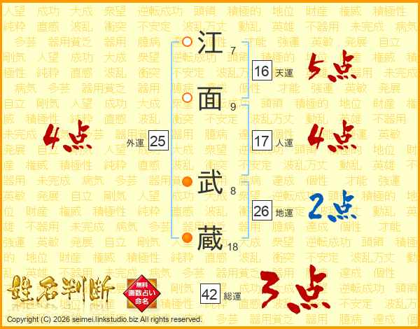 江(7画)面(9画) 武(8画)蔵(18画)