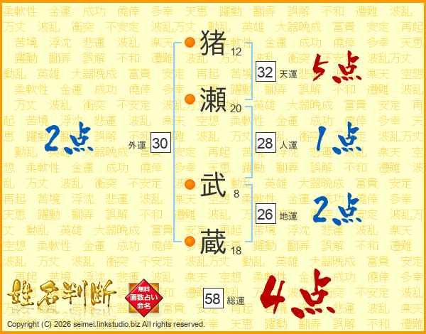 猪(12画)瀬(20画) 武(8画)蔵(18画)