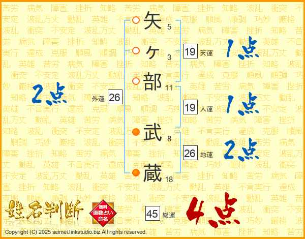 矢ヶ部武蔵さんの総運は45画の4点!