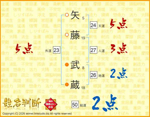 矢(5画)藤(19画) 武(8画)蔵(18画)