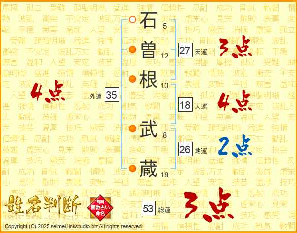 石(5画)曽(12画)根(10画) 武(8画)蔵(18画)