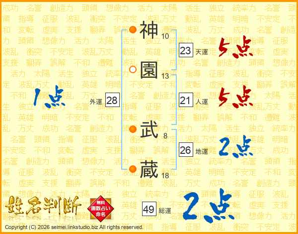 神(10画)園(13画) 武(8画)蔵(18画)