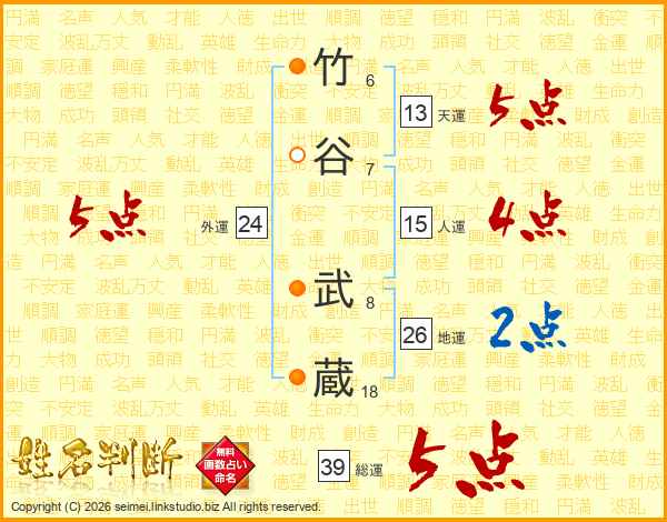 竹谷武蔵さんの総運は39画の5点!