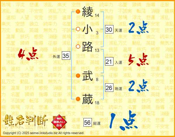 綾(14画)小(3画)路(13画) 武(8画)蔵(18画)
