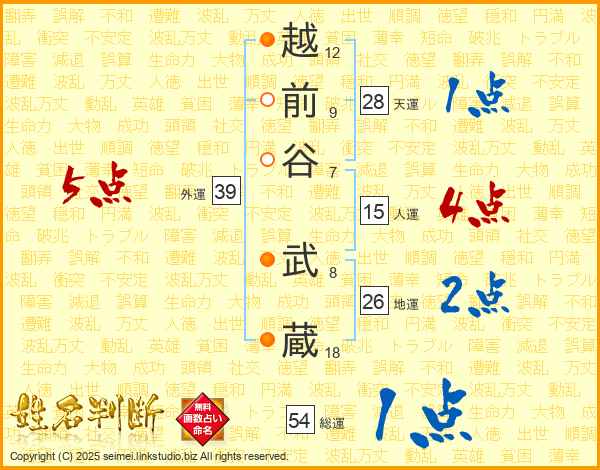 越(12画)前(9画)谷(7画) 武(8画)蔵(18画)