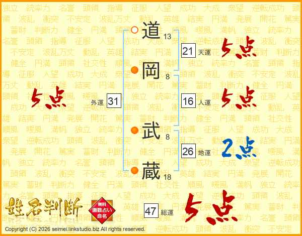 道岡武蔵さんの総運は47画の5点!