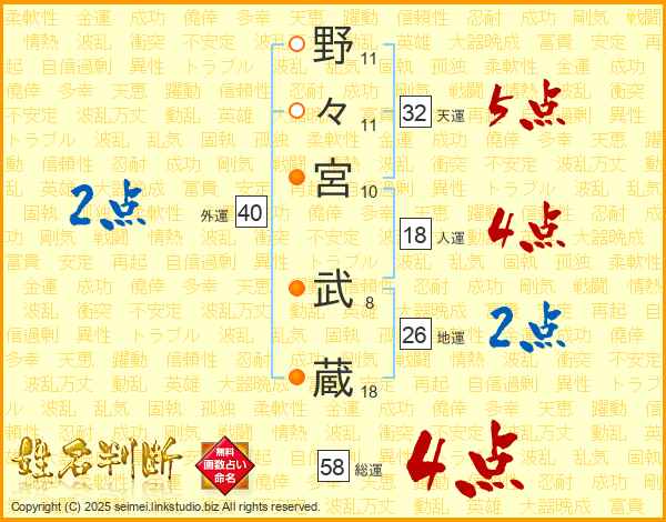 野々宮武蔵さんの総運は58画の4点!