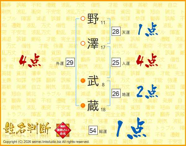野(11画)澤(17画) 武(8画)蔵(18画)