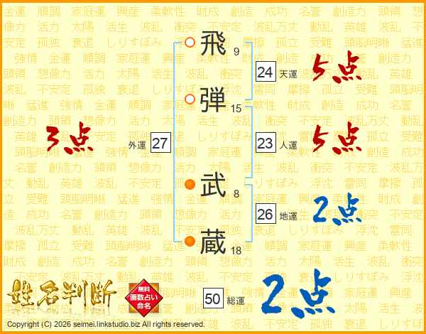 飛(9画)弾(15画) 武(8画)蔵(18画)