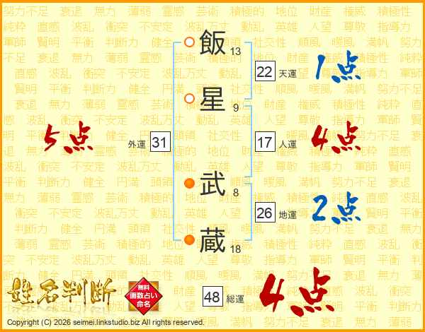 飯(13画)星(9画) 武(8画)蔵(18画)
