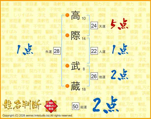 高(10画)際(14画) 武(8画)蔵(18画)