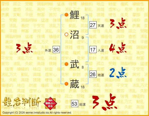 鯉(18画)沼(9画) 武(8画)蔵(18画)