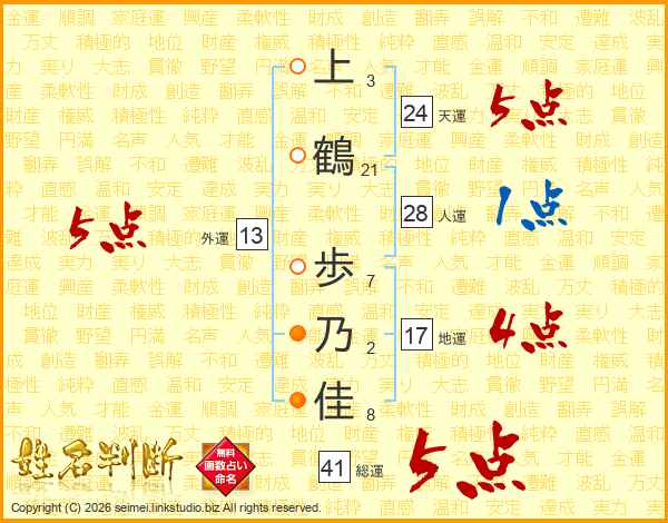 上(3画)鶴(21画) 歩(7画)乃(2画)佳(8画)