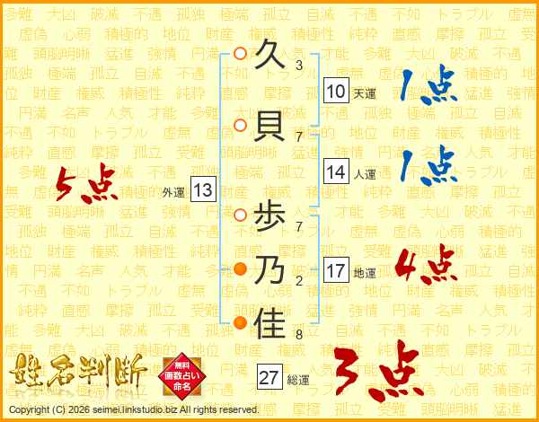 久(3画)貝(7画) 歩(7画)乃(2画)佳(8画)
