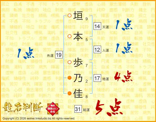 垣(9画)本(5画) 歩(7画)乃(2画)佳(8画)