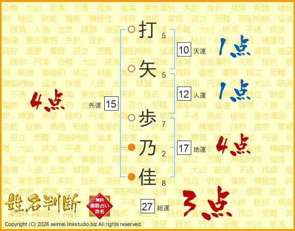 打(5画)矢(5画) 歩(7画)乃(2画)佳(8画)