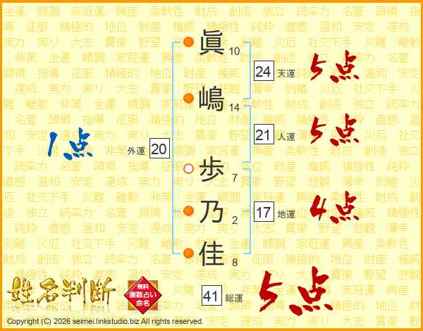 眞(10画)嶋(14画) 歩(7画)乃(2画)佳(8画)