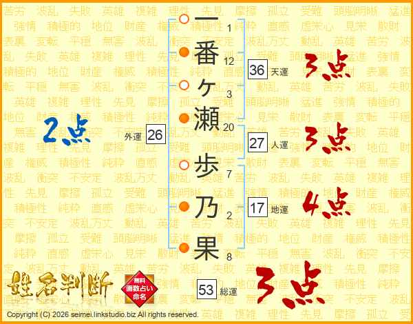 一番ヶ瀬歩乃果さんの総運は53画の3点!