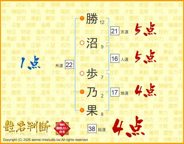 勝(12画)沼(9画) 歩(7画)乃(2画)果(8画)