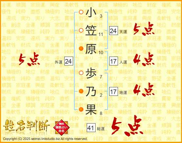 小(3画)笠(11画)原(10画) 歩(7画)乃(2画)果(8画)