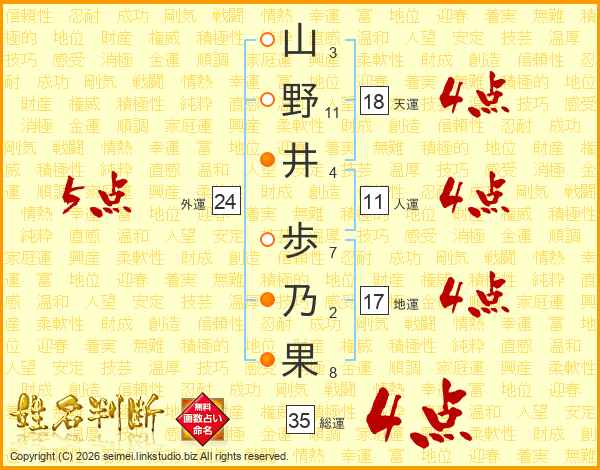 山(3画)野(11画)井(4画) 歩(7画)乃(2画)果(8画)