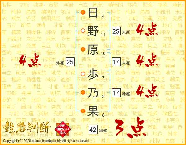 日(4画)野(11画)原(10画) 歩(7画)乃(2画)果(8画)