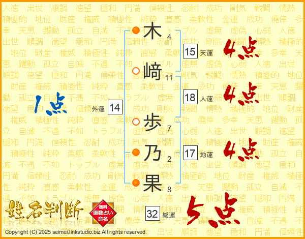 木(4画)﨑(11画) 歩(7画)乃(2画)果(8画)