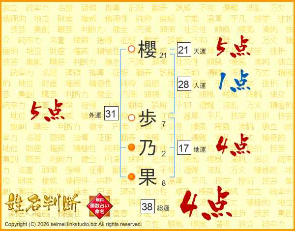 櫻(21画) 歩(7画)乃(2画)果(8画)