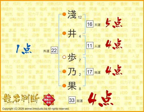 淺(12画)井(4画) 歩(7画)乃(2画)果(8画)
