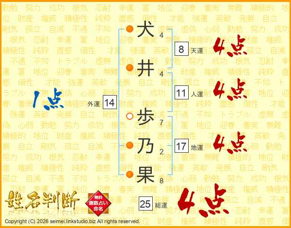 犬(4画)井(4画) 歩(7画)乃(2画)果(8画)