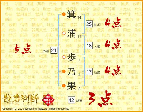 箕(14画)浦(11画) 歩(7画)乃(2画)果(8画)